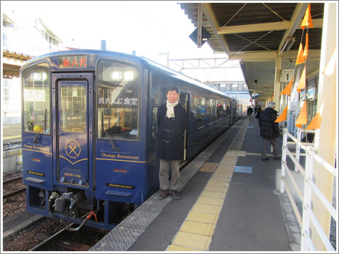 再び鹿児島中央駅に戻る。途中、さんふらわあカラーの路面電車にも遭遇。こうやって、さんふらわあは、鹿児島にも息づいているんだなと思う。鹿児島中央駅からは、JRと肥薩おれんじ鉄道を乗り継いで出水へ。途中、雪がちらついたりしてびっくりもしたが、たそがれ近づく出水は、いい天気。これから、約2時間、おれんじ食堂のプレミアムディナーに乗る。今回のモニターツアーに当たった時には、真っ先にこれに乗ろうと思っていた代物。その時を迎え、期待に心踊る。藍色の列車が入線。記念写真後、颯爽と乗車。室内は水戸岡デザイン、木材をふんだんに使い、テーブルライトには暖色の灯りが。とても良い雰囲気。16:40、おれんじ鉄道の社員の方々に見送られて発車。早速食事スタートと思いきや、水俣発車後からだそうで。その前に、アテンダントの方の挨拶放送、そして、鹿児島-熊本県境で、列車は停止。境橋の説明が入る。鹿児島本線だった時には、幾度か通った路線のはずなのに、車窓から明治に作られた歴史的な橋が眺められるなんて知らなかった。100年以上、いくつもの時を超えてきた橋に敬意を示し、列車は薩摩から肥後に入っていった。