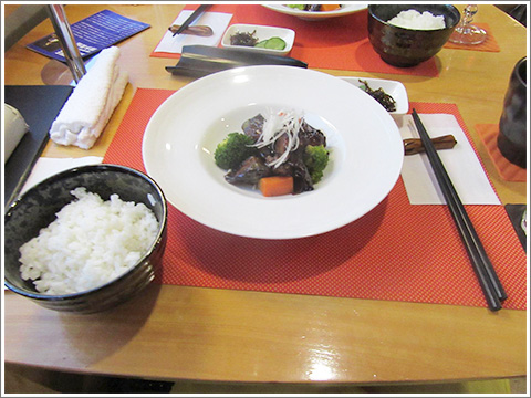 そして、魚料理。鹿児島県産ぶりの照り焼き。合わせて焼酎も。もう、これがたまらない。ほろ酔い状態も手伝って、ご機嫌ご機嫌。ゆっくり味わっていただく。肉料理は黒豚の塩麹漬け。野菜を含めて、黒酢とマーマレードソースとの組み合わせがとてもよく合う。たかえびと柚子のお吸い物も絶品。列車の中とは思えない味にご満悦。隣の1号車では博多俊輔氏のJAZZピアノによるクルージングコンサートも。軽快に奏でる音楽と、暮れゆく有明湾、遠くに見える天草の車窓。夢心地というのはまさにこのことだろう。抹茶のケーキにコーヒーのデザートで旅の余韻を味わいつつ、おれんじ食堂は終点、新八代着。あっという間、料理もお酒もおいしかった。それ以上に、一生懸命にもてなそうとしてくださるアテンダントさん達の思いが伝わってくるような、そんな印象に残る大満足の2時間だった。