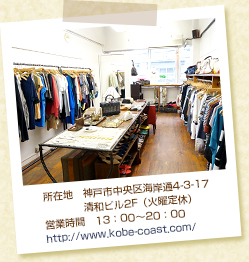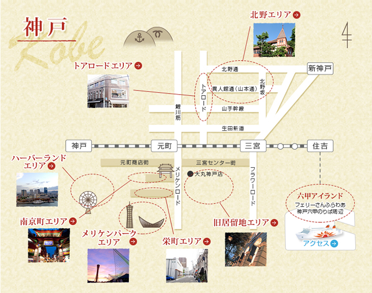 アクセス:三ノ宮駅から徒歩約25分、元町駅から徒歩約15分、神戸駅から徒歩約17分