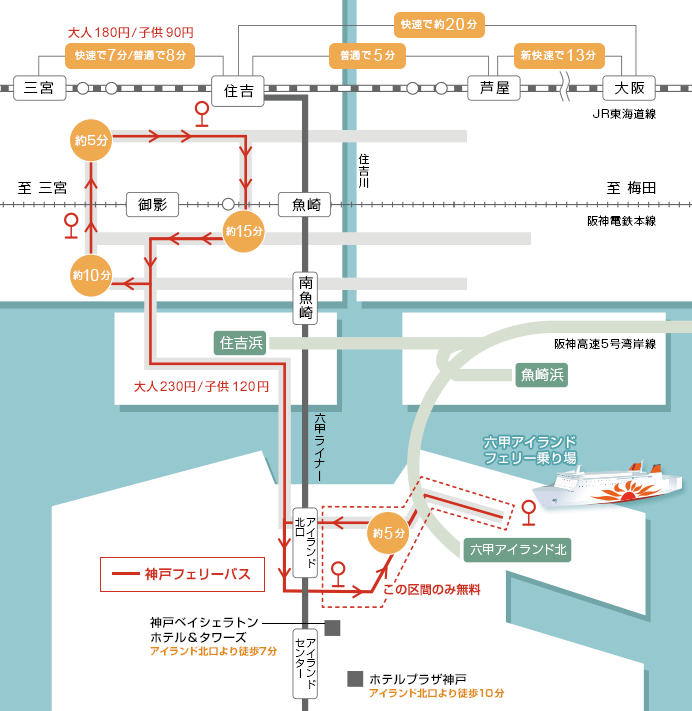 - 六甲アイランド フェリーのりばから神戸フェリーバスで約15分(料金 大人230円)