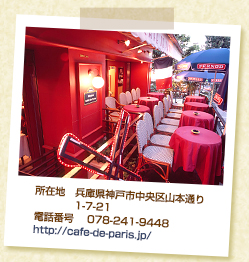 北野異人館へと続く北野坂に面したフレンチレストラン、ビストロ カフェ・ド・パリ。異国情緒漂う北野坂にあるビストロカフェです。明るい陽光が差し込む店内のベージュの壁に赤のソファなどハイセンスなインテリアは、まさにパリのカフェそのもの。カフェのご利用だけでなく、ランチやディナーもお楽しみ頂けます。