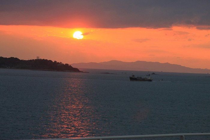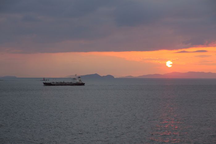 「来島海峡を過ぎると雲間から沈む太陽が現れました。港に帰るであろう船が通りかかり夢中でシャッターを切りました。」