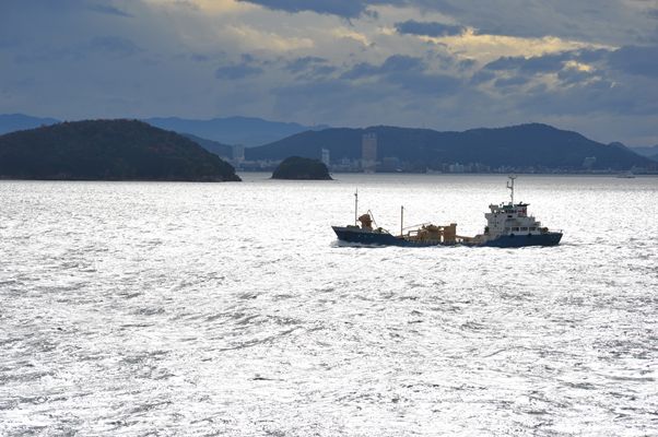 「高松市沖を航行中、曇天の中のぞかせた太陽光に海が輝いていたところを撮影しました。」