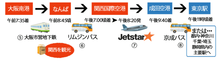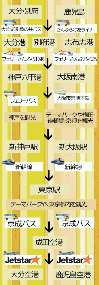 九州から関西まで船旅を楽しんで、関西、関東で観光した後、関東から帰ってくるルートです。