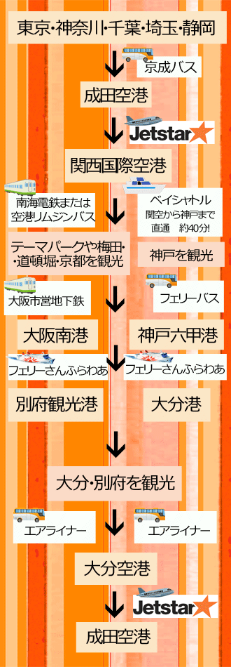 関東発 モデルコース 関西で観光してから、関西から九州まで船旅を楽しんで、九州で温泉につかって帰ってくるルートです。 |