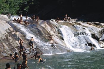 荒瀬川の下流にあり、落差6メートル・幅30メートルの滝が三段に連なっています。水量も豊富で非常に冷たく、滑らかな巨岩は自然の滝すべりをする子供たちの楽園です。