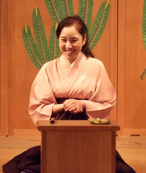 高座におかれた釈台と呼ばれる小さな机の前に座り、張り扇でそれを叩いて調子を取りつつ、軍記物や政談など主に歴史にちなんだ読み物を語る、日本では数少い上方講談師の彼女は一見の価値あり。