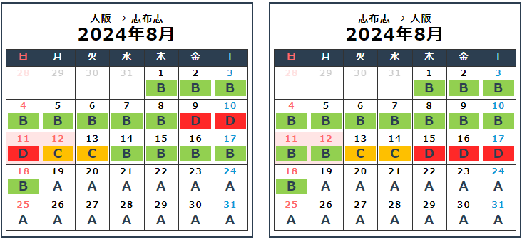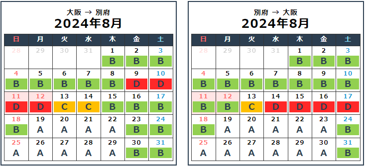 | 8月 | 神戸→大分 | 大阪→別府 | 大阪→志布志 | 大分→神戸 | 別府→大阪 | 志布志→大阪 | |