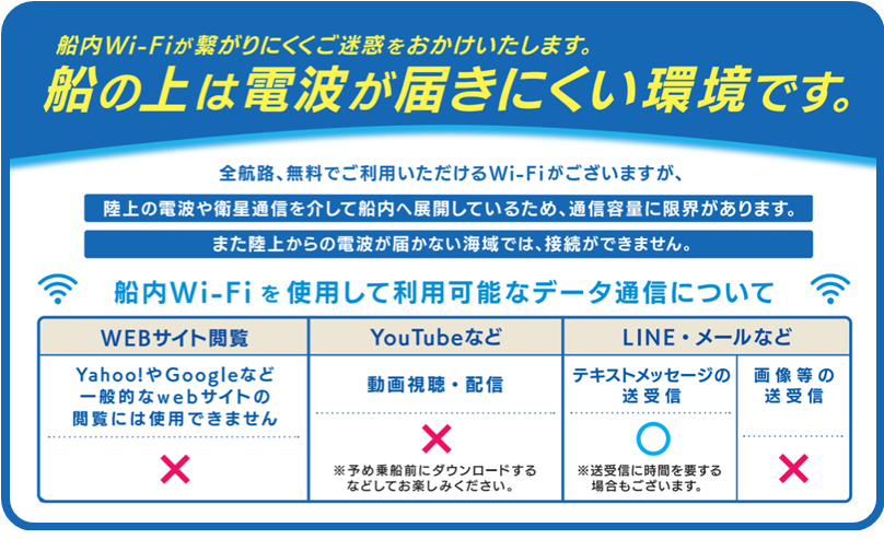 各航路のWi-Fi状況については上記各航路のボタンをクリックしてご確認ください。船内の電波環境につきまして予めご了承のほどよろしくお願いいたします。