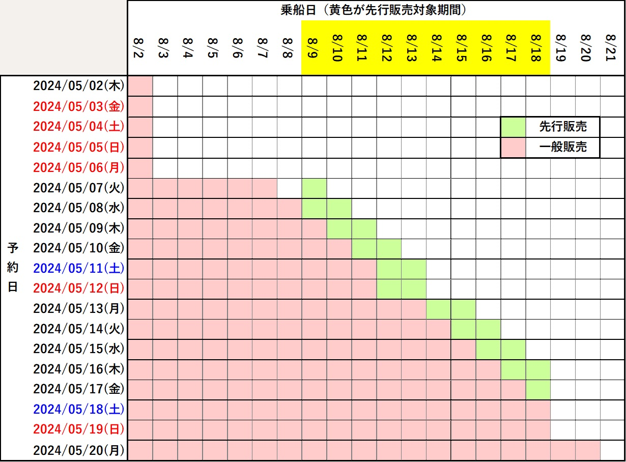 5月19日(日)をもちまして対象乗船期間の先行販売期間は終了しました。先行期間終了後は通常の予約条件にて各日程ご予約可能です。 |
