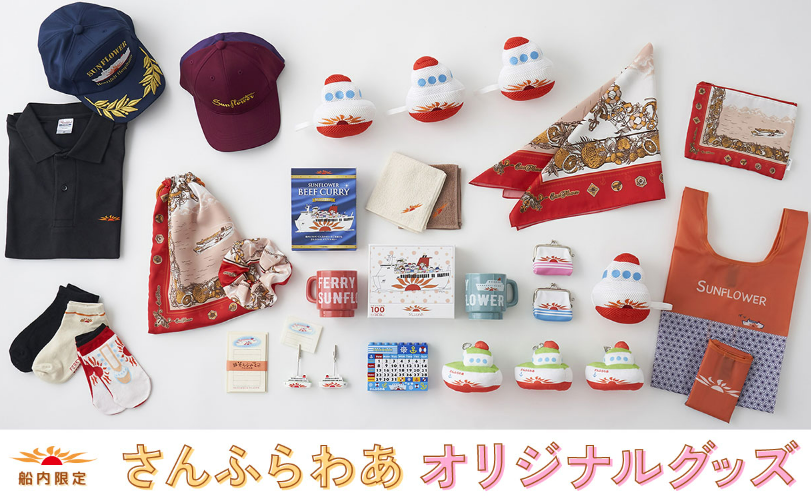 九州や関西のお土産、さんふらわあグッズ、おかしや飲料など様々取りそろえた売店でございます。