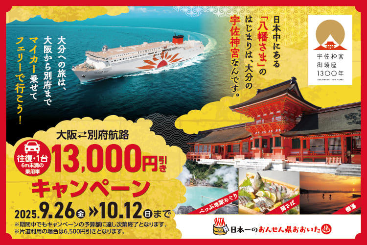 今年の秋は、大分県宇佐神宮御鎮座1300年にあわせたイベントがたくさん!源泉数、湧出量で日本一の温泉地”大分県”に関連した、 キャンペーン期間中は、マイカー運賃割引でお得に関西~大分を行き来できます。デジタルスタンプラリーや県内周遊バス、宇佐神宮御鎮座1300年関連イベントなど、大分の魅力が目白押し! 今年の秋は”おんせん県おおいた”を満喫しましょう♨ なお本キャンペーンの一部は、大分県の助成金を受けて実施します。 |