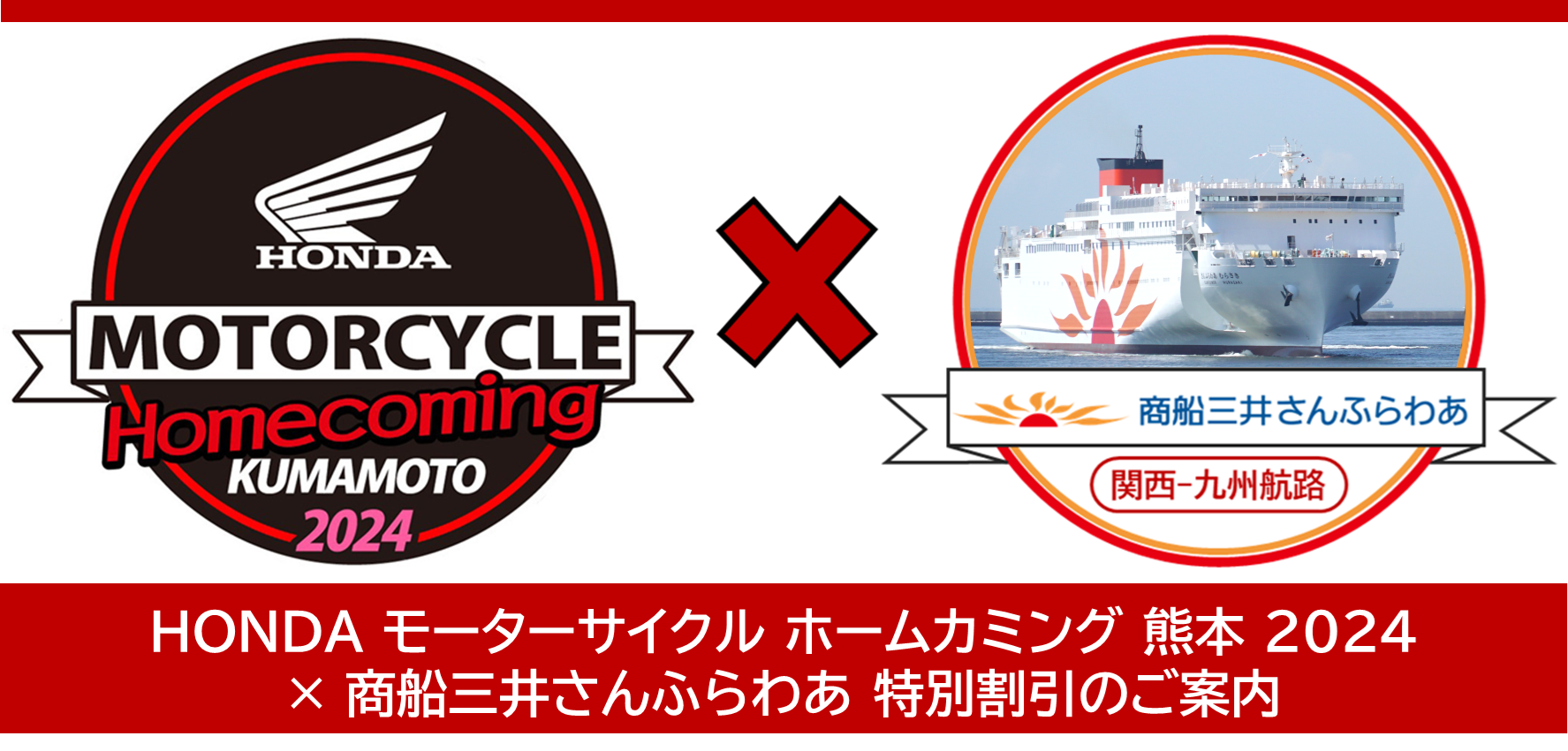 この度、商船三井さんふらわあでは、普段より国内工場におけるご輸送の一部で当社航路をご活用いただいている本田技研工業様とご協力させていただき、11月2日(土)に同社熊本製作所で開催される「Honda モーターサイクル ホームカミング 熊本 2024」に参加されるお客様を対象に特別割引(コラボ割引)を実施させていただくこととなりました。