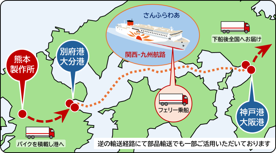 商船三井さんふらわあ 大分神戸航路・大阪別府航路は、本田技研工業熊本製作所に関するご輸送でも一部ご活用いただいております。フェリー(船舶)を輸送の一部に活用する取組みは輸送時の環境負荷を低減させる「モーダルシフト」として注目される他、トラックドライバーの2024年問題といった各種社会的課題に対しても有効な手段の一つです。