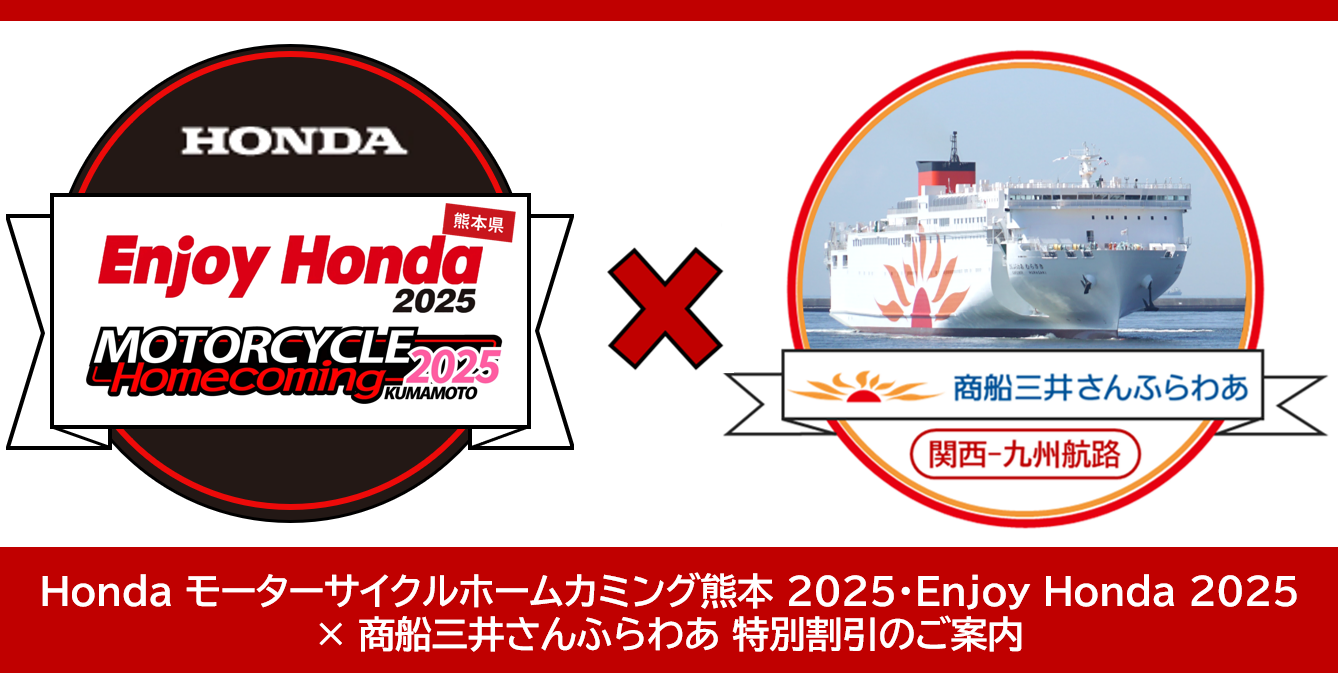 この度、商船三井さんふらわあでは、普段より国内工場におけるご輸送の一部で当社航路をご活用いただいている本田技研工業様とご協力させていただき、10月5日(日)に同社熊本製作所で開催される「Honda モーターサイクルホームカミング熊本 2025」ならびに10月4日(土)と5日(日)に隣接するHSR九州で開催される「Enjoy Honda 2025 HSR九州」に参加されるお客様を対象に特別割引(コラボ割引)を実施させていただくこととなりました。