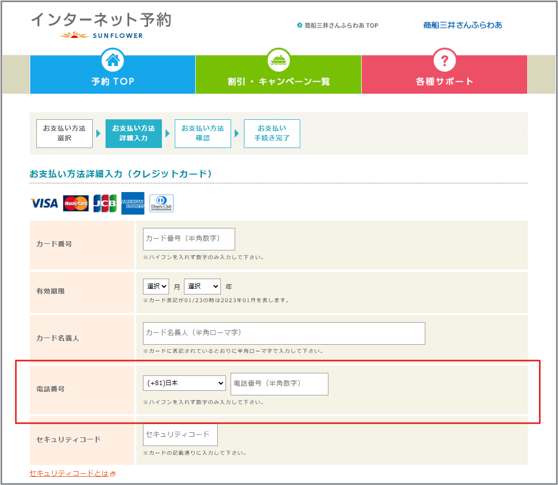 クレジットカード決済を選択され暗証番号入力を行う際、電話番号を入力する項目がございます。こちらには「予約時の電話番号(代表者)」をご入力ください。