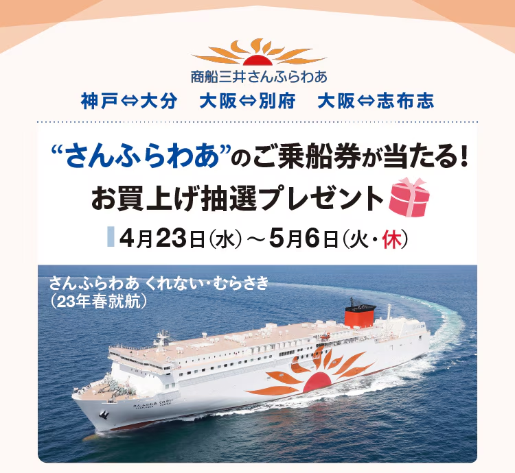 期間中に大九州展にて1レシート税込5,000円以上お買い上げのお客様を対象に、後日抽選でさんふらわあ(関西~九州航路)ペア往復乗船券を3組様(1組2名様)にプレゼントいたします。