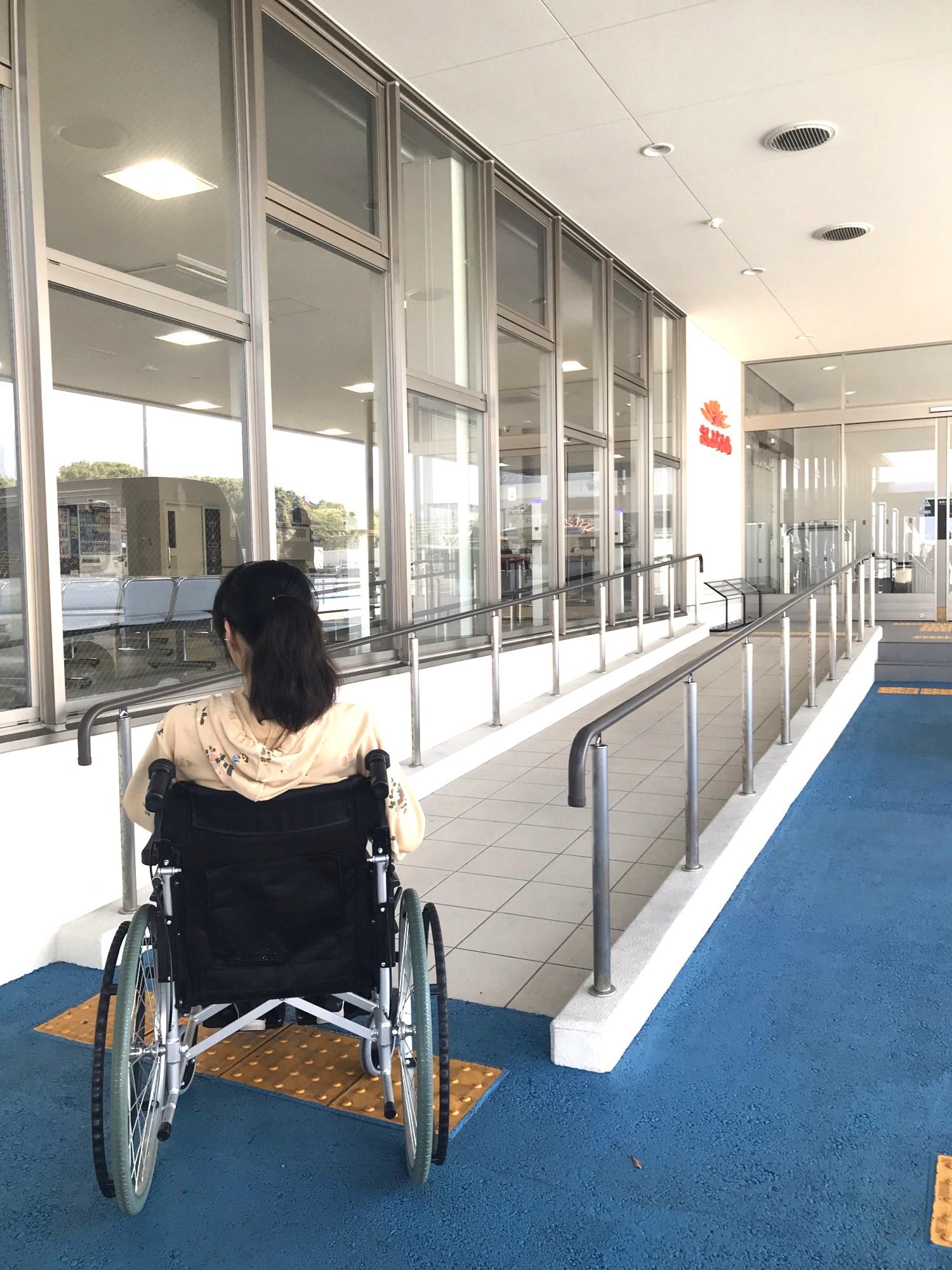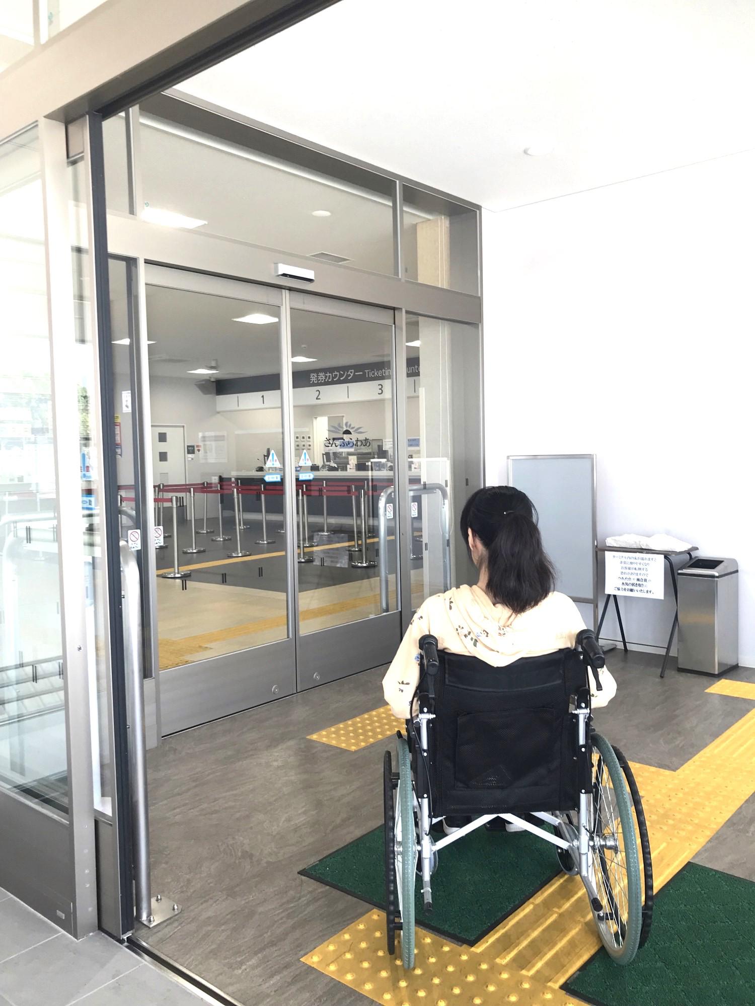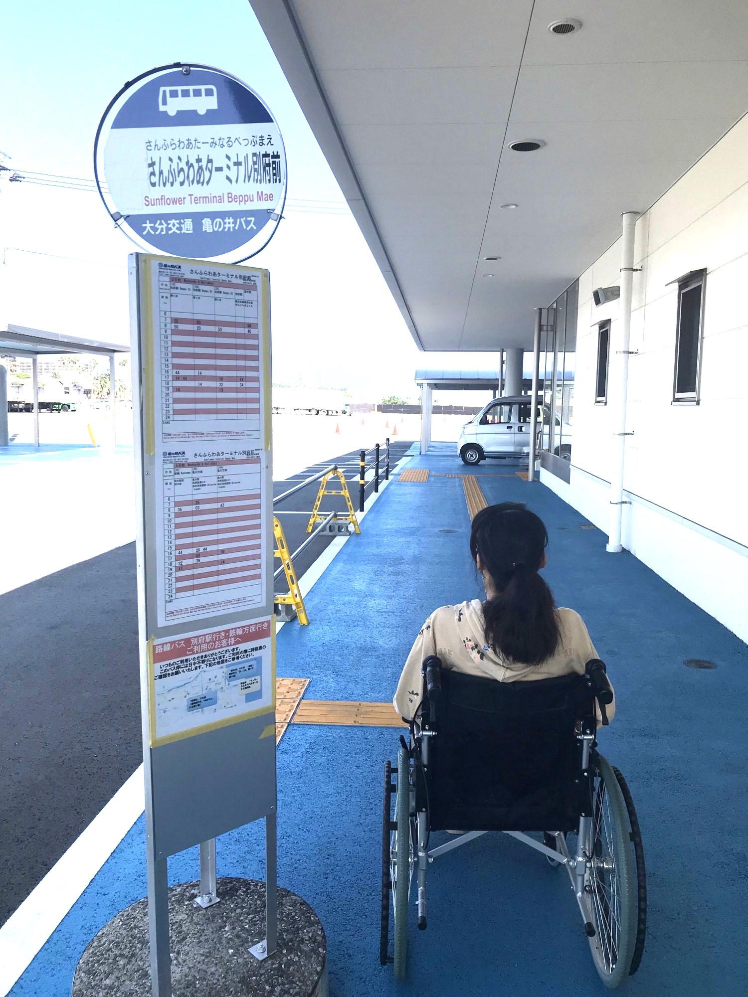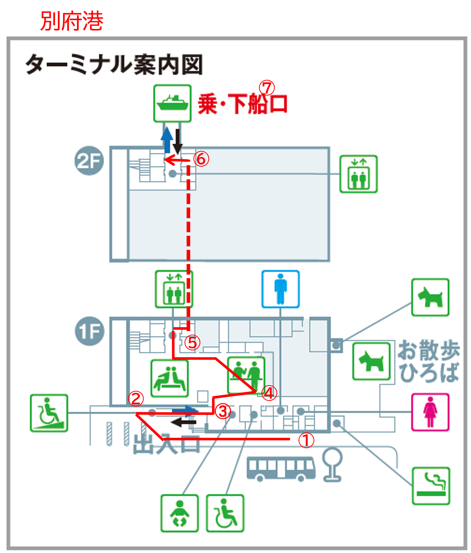 ①バス停を降りてターミナルへ入ります。乗船口までは約5分です。 |