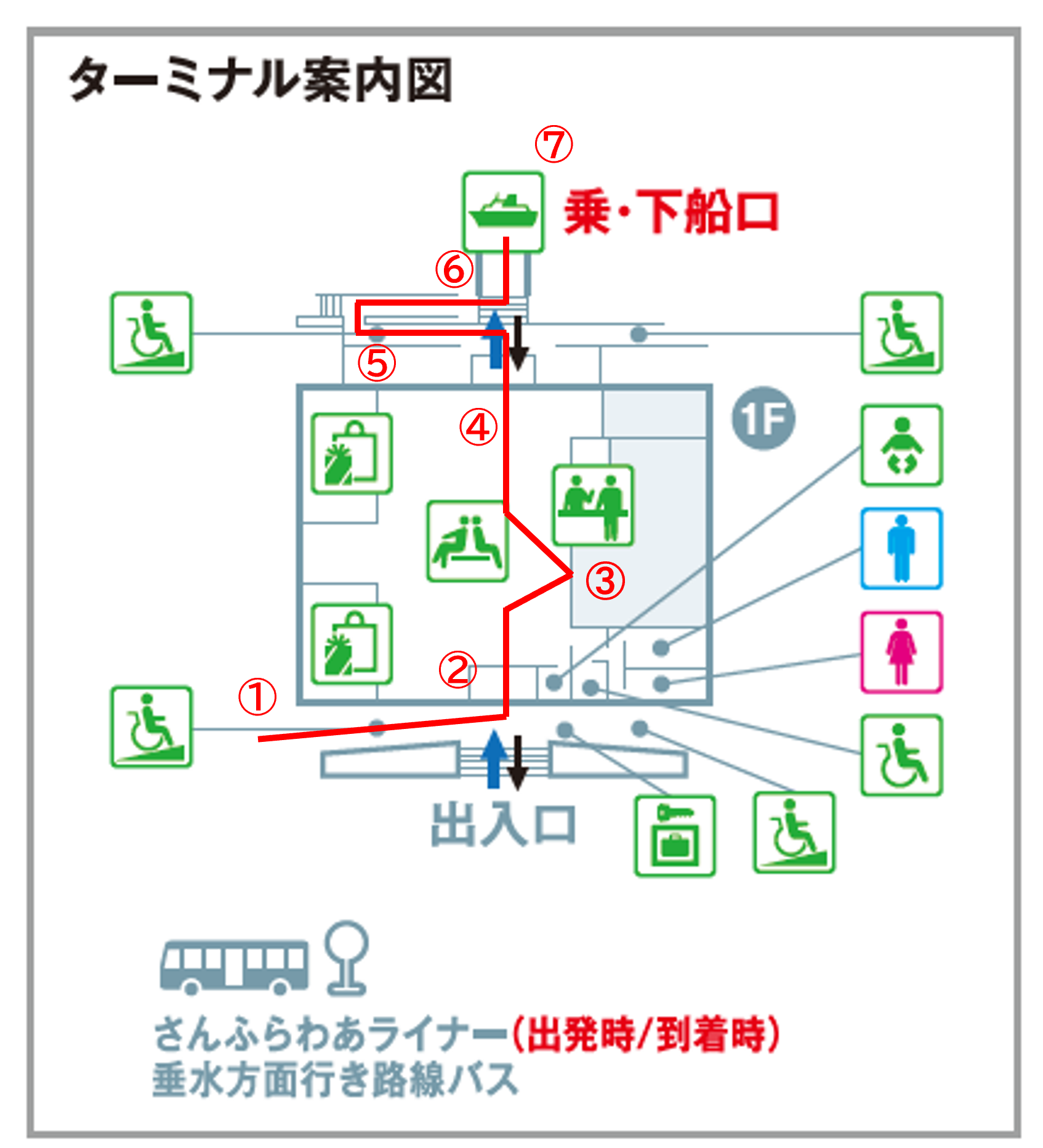 ①スロープを進みます。乗船口までは約5分です。 |