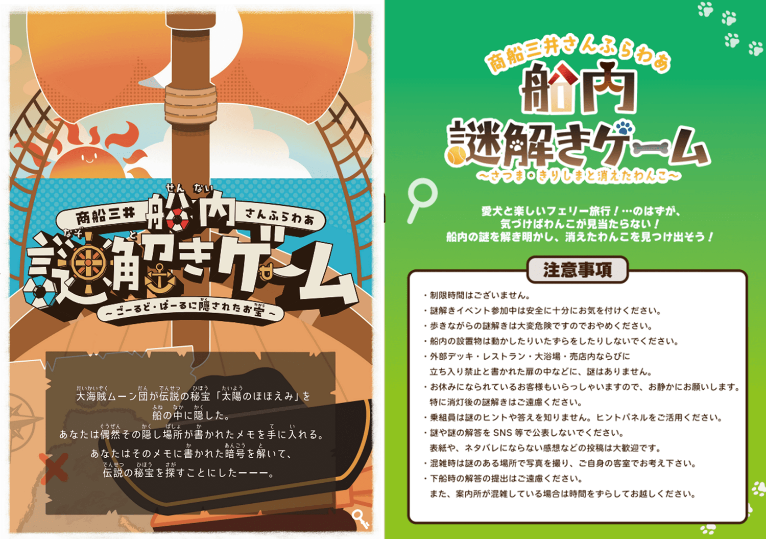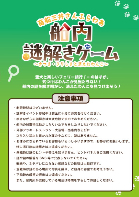 大好評につき第2弾! 参加者のみなさまが、フェリーの船内を探検しながら、あるエピソードを探す謎解きを行うイベントです。