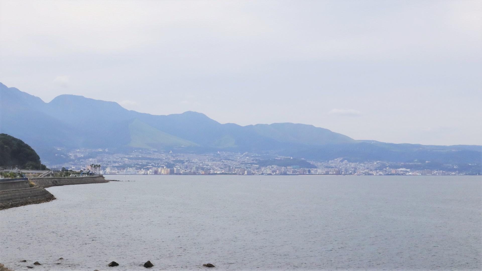 先程テイクアウトしたおにぎり定食の朝食を、かんたん港園から穏やかな別府湾(菡萏湾)を眺めつついただきましょう。朝食を済ませれば次の目的地「天海の湯」へ出発です。