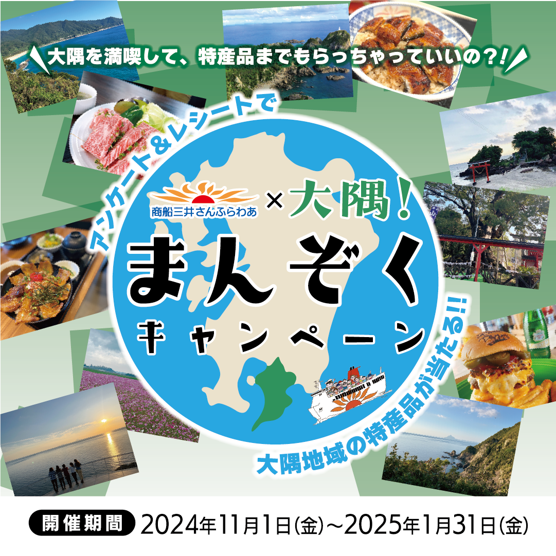 2024年11月1日(金)~2025年1月31日(金)の期間、大阪~志布志航路(大阪発)をご利用のお客様を対象に、鹿児島県大隅地域の特産品や当社の乗船券が当たるキャンペーンを実施します。