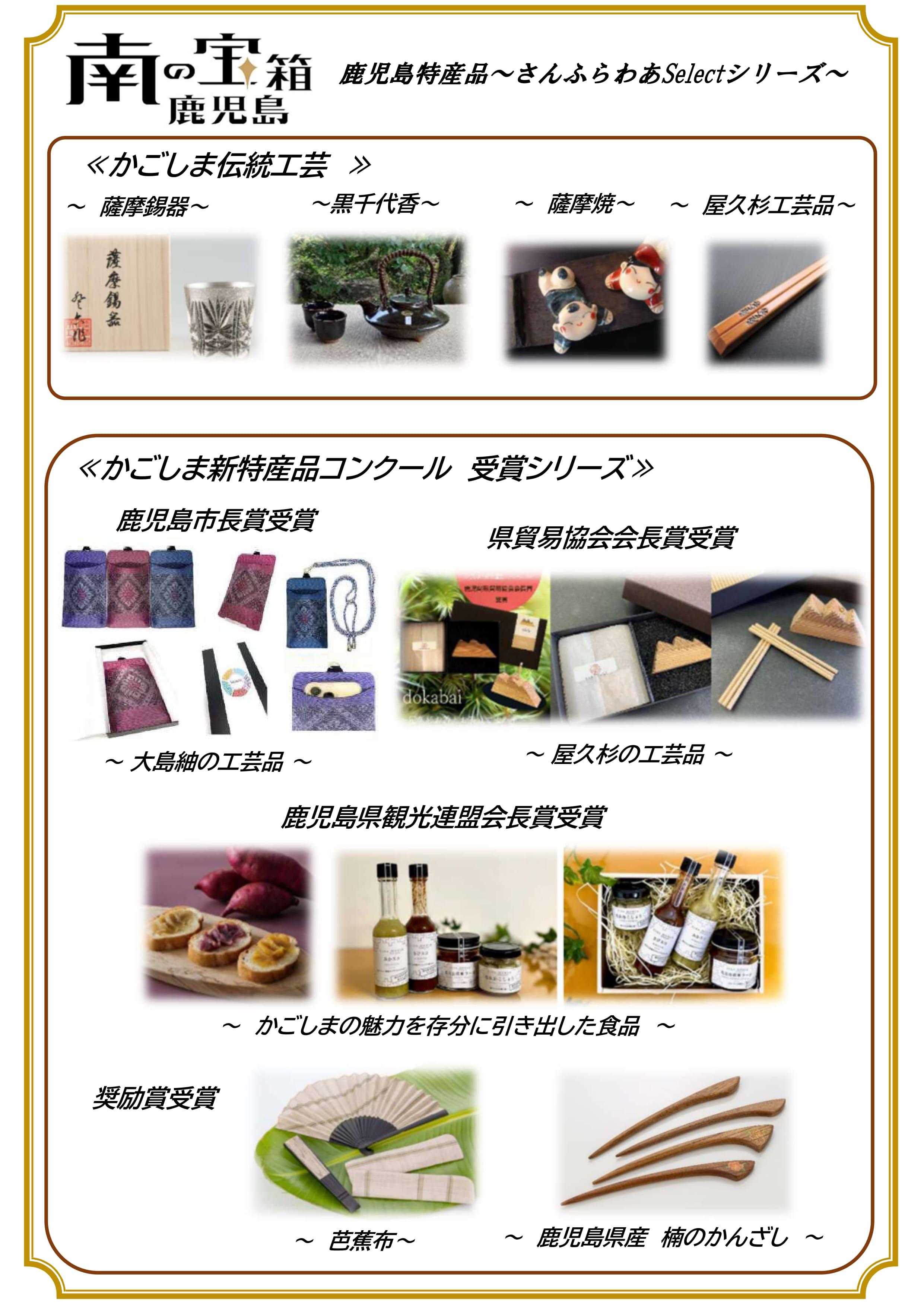 鹿児島の豊かな自然と伝統が息づく厳選された鹿児島ブランドの商品を紹介するコーナーを設置し、旅の始まりから鹿児島の魅力をお届けします。船内において 『買う楽しみ』 だけではなく 『知る楽しみ』 も感じていただけます。ぜひ、この機会に鹿児島の魅力を手にとって感じてください。このイベントを通じて、鹿児島の地を訪れるきっかけになれば幸いです。