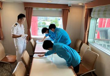 生徒3名に対し職業体験として、当社が運航する船舶「さんふらわあ ごーるど・ぱーる」の船内で当社乗組員の指導のもと、操舵室・機関室等の見学および旅客サービスの営業準備を行い、また神戸港ターミナルで当社スタッフの指導のもと、ターミナル・ヤードの見学および旅客・物流向けの窓口書類の準備等を行いました。