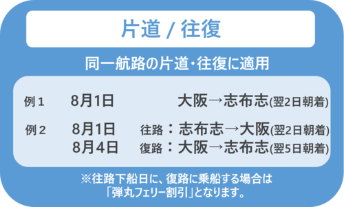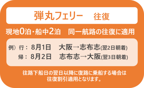 大阪↔志布志航路において、「web割引」「往復割引」「弾丸フェリー(割引)」からさらに割引した運賃でご乗船いただけます。乗用車、特殊手荷物等には適用いたしません。