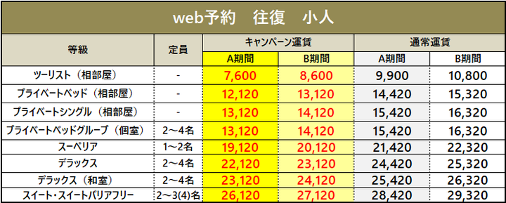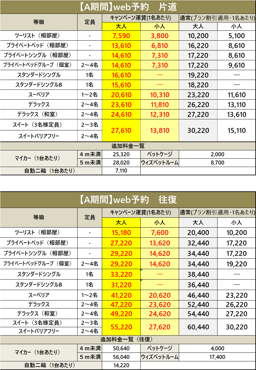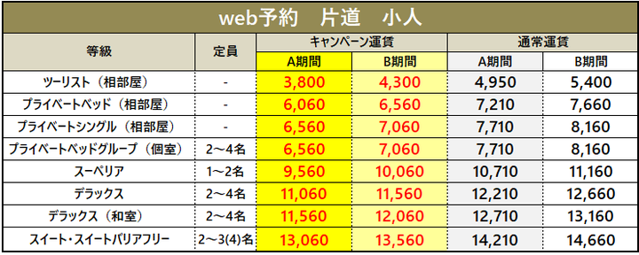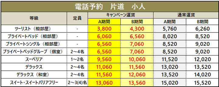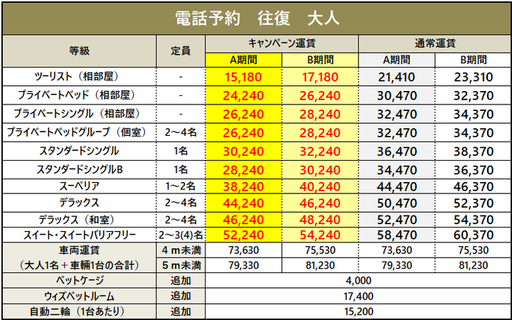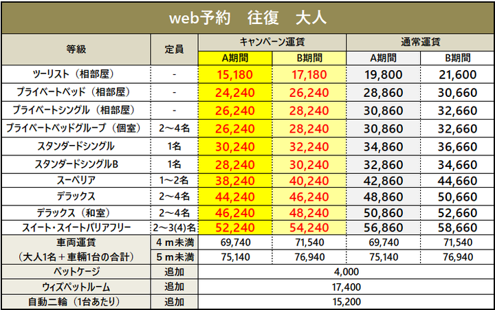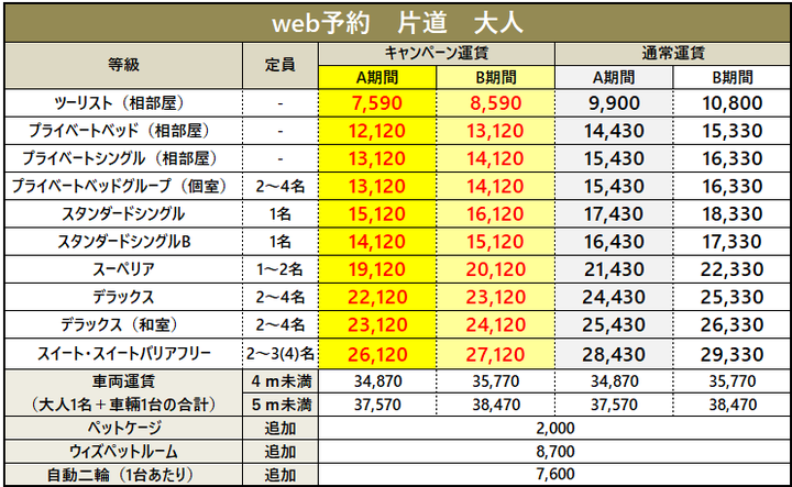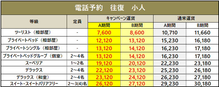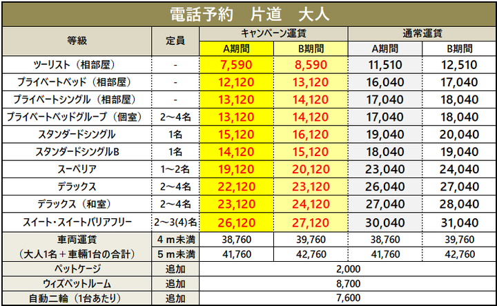 ・車両運賃は大人1名様のプラベートベッド料金を含みます。