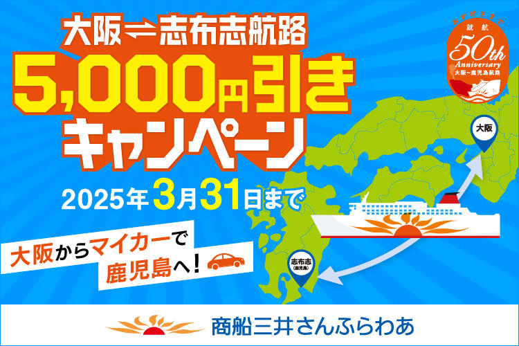 いつも商船三井さんふらわあをご利用いただきありがとうございます。 この度、航路開設50周年をむかえた大阪志布志(鹿児島)航路において、乗用車航送料金が5,000円(片道/税込)引きとなるキャンペーンを実施致します! ぜひこの機会に、お得に「さんふらわあ」を利用してお車で鹿児島や関西・中京地区へ行きませんか。 なお本キャンペーンは、鹿児島県志布志・大阪航路利用促進協議会「令和6年度乗用車利用対策事業」を受けて実施致します。 |