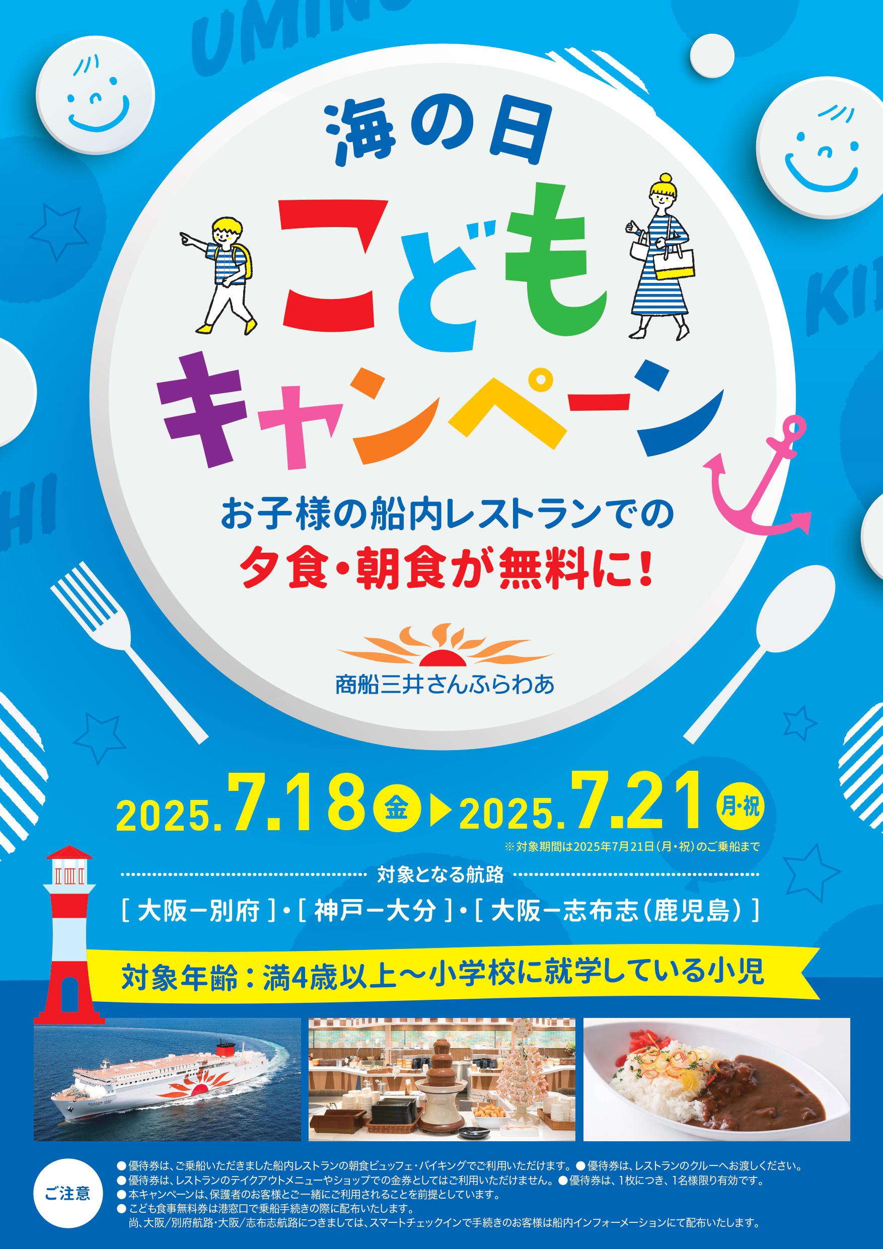 7月21日(月・祝)の海の日にちなんで、7月18日(金)~7月21日(月・祝)にご乗船のお子様を対象に、「レストランの夕食・朝食が無料」になる「海の日 こどもキャンペーン」を日本旅客船協会とのタイアップで実施します!2023年春に就航したばかりの新造船も対象です。