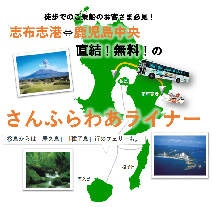 鹿児島市内から志布志港までお越しの方、志布志港から鹿児島市内はもちろん、桜島、屋久島・種子島、