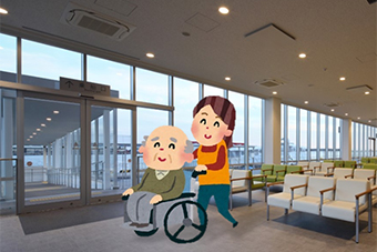 当社は、お客さまを目的地まで安全に輸送することを生業としております。そのため当社係員及び乗組員は、身の回りのこと(※1)等の介助及び医療サービスの提供を承ることは出来ません。介助が必要なお客さまは、お付き添いのかたの同伴をお願いいたします。また、お付き添いのかたには、港ターミナル内・乗船時・航海中・下船時における介護や援助、及び緊急時の誘導・援助などをお願いいたします。客室および船内施設のドア幅についてはこちら。