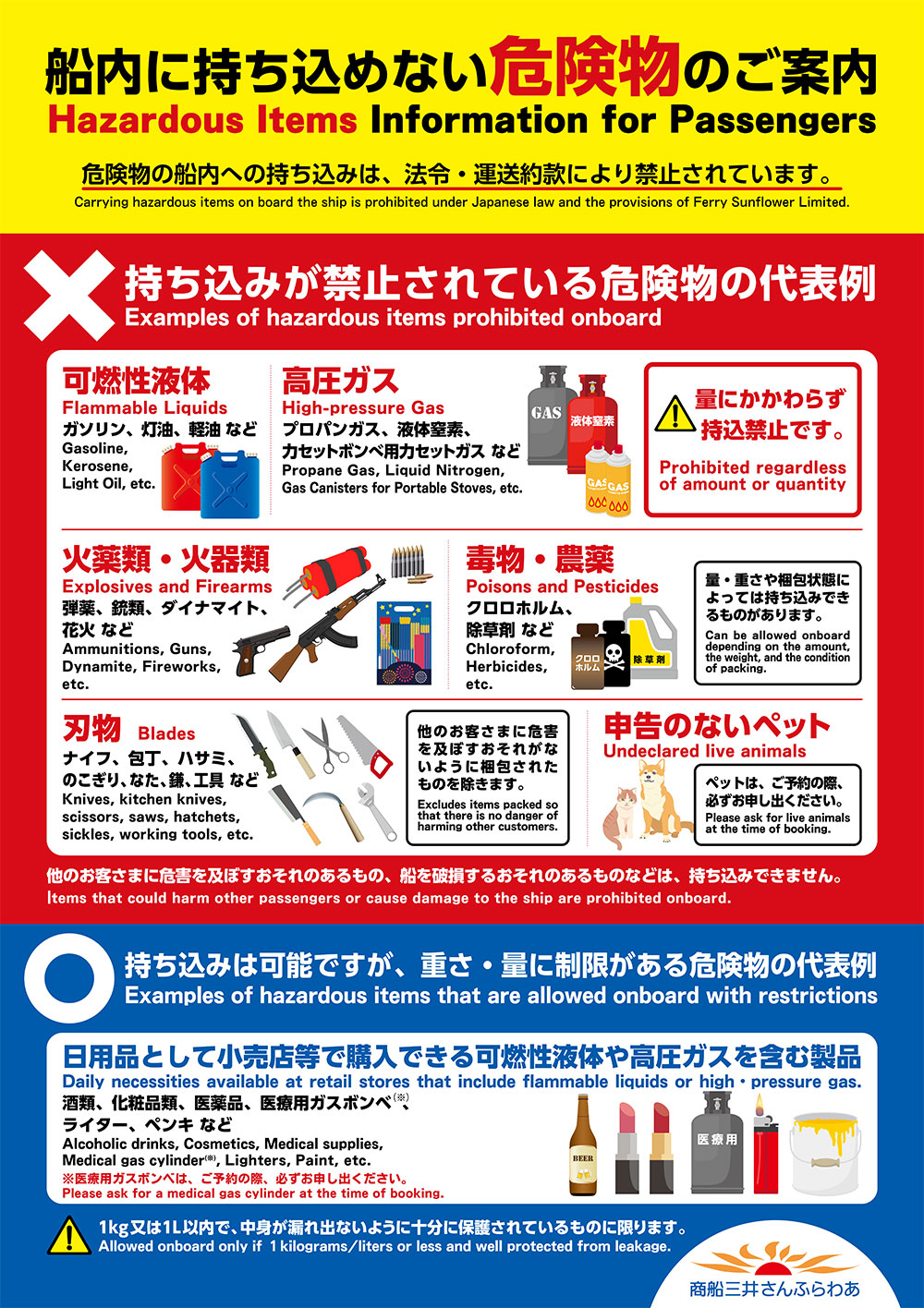 航路によっては12時間を越える長時間の航行となり、船内には医師、医療設備は備え付けておりませんので、天候その他の理由などで予期せぬ事態が生じることが予想されるような場合(航行中にお客様の健康に悪影響を与えると考えられることが予測される場合)等には、ご予約を頂いておりましても当日船長判断で ご乗船をお断りすることがございますので、予めご承知おきください。