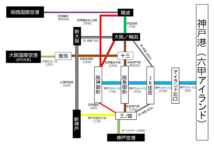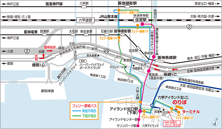 公共交通機関をご利用のお客様は、阪神「御影駅」または阪急「御影駅」またはJR「住吉駅」または六甲ライナー「アイランド北口駅」のいずれかのバス停から、神戸港フェリー連絡バスにご乗車ください。