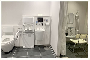 車いす対応の手すりつきトイレ・シャワー、シャワーチェア、オストメイト用設備をご用意しております。