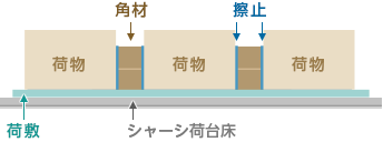 荷物に隙間があると、不十分な固縛による移動と同じく、荷物が移動する原因になります。基本は、隙間全体を埋める必要があり、隙間に角材等を入れたりしてください。形状が安定していない積荷にたいしては十分な転倒防止対策を行ってください。