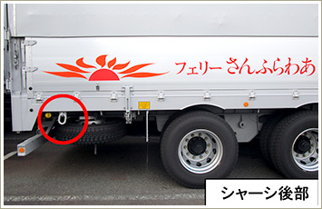 車両側においても、固縛装置の取り付けが出来る車輛リングの設置が必要です。海上の荒天時は車輛リングが完全でなく(車輛リングの取り付け位置が悪い、消耗しており壊れやすくなっている等)安全が確保できない車両については、やむを得ず乗船をお断りする場合があります。