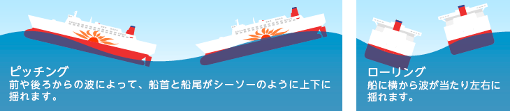 船舶が海上を航行する際には、海上が静かな時は殆ど船体が動揺することもなく、陸上走行時より衝撃は少ないですが、一旦時化(しけ)ると陸上走行中よりはるかに複雑な、強風・波による横揺れ(ローリング)・縦揺れ(ピッチング)その他の動揺が発生し、荷物が衝撃を受けたり移動するだけでなく、車両そのものが移動、また最悪の場合は転倒することがあります。