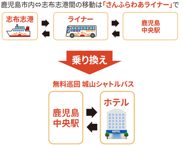 ※志布志港⇔鹿児島中央駅まではさんふらわあライナー(高速シャトルバス)が無料でご利用いただけます(事前予約制)