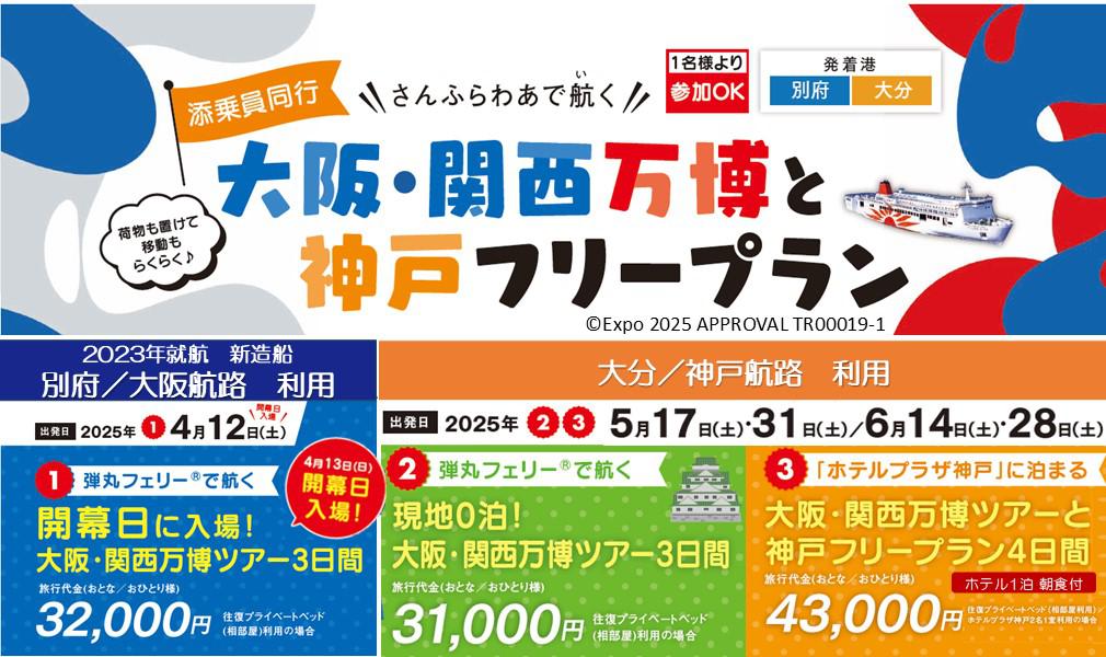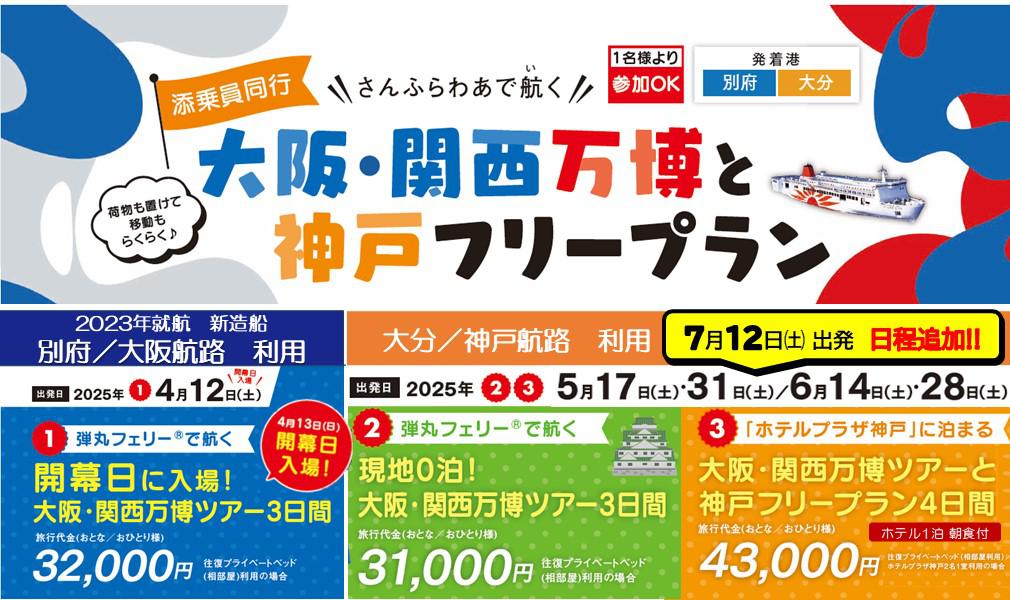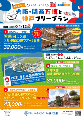 | ★添乗員同行!!【大阪・関西万博と神戸フリープラン】 全部で5日程をご用意 ●4月12日(土) 出発は、往復 2023年に就航した新造船である 「別府/大阪航路」を利用し、万博開幕日の入場です! ●5月17日・31日 / 6月14日・28日 出発は、すべて土曜日出発! 弾丸・「ホテルプラザ神戸」宿泊 の2タイプからご選択ください。 |