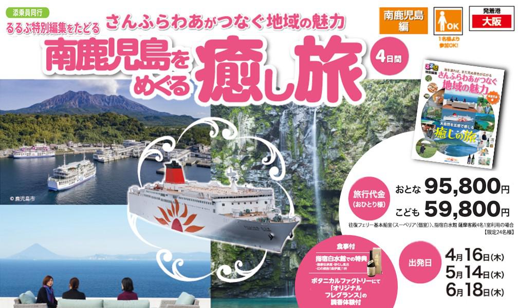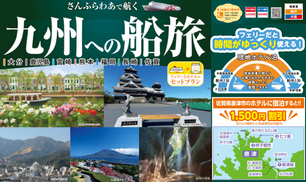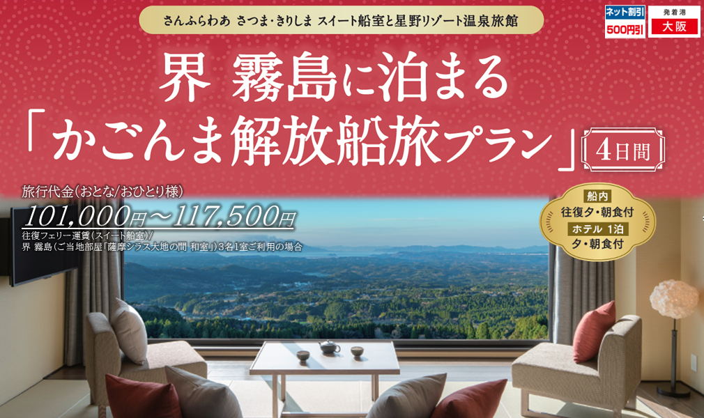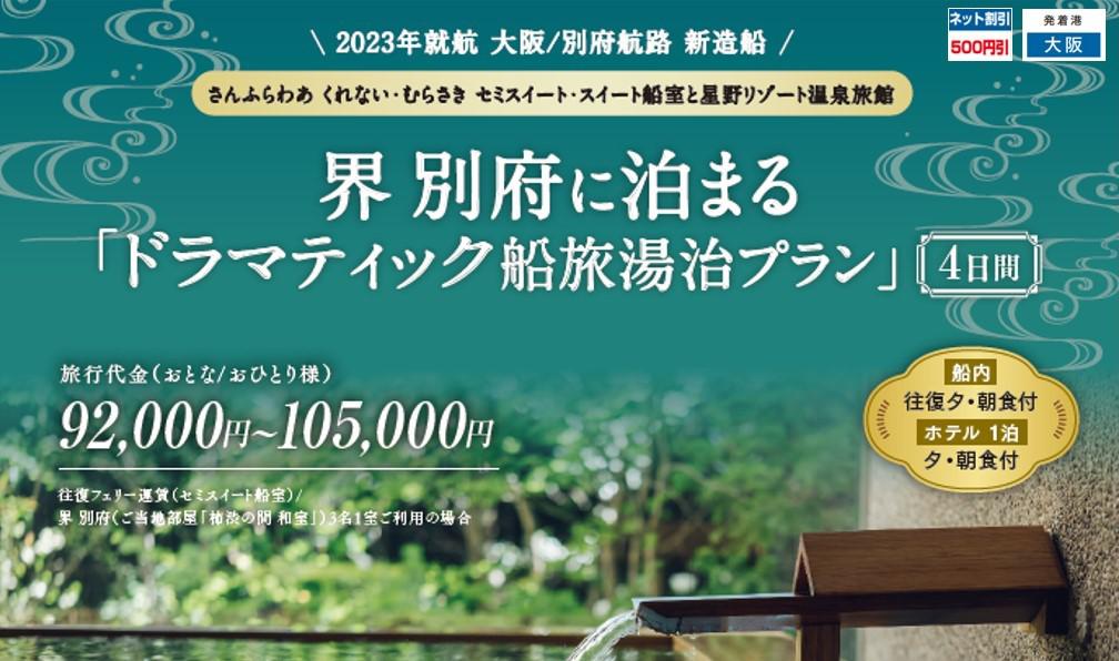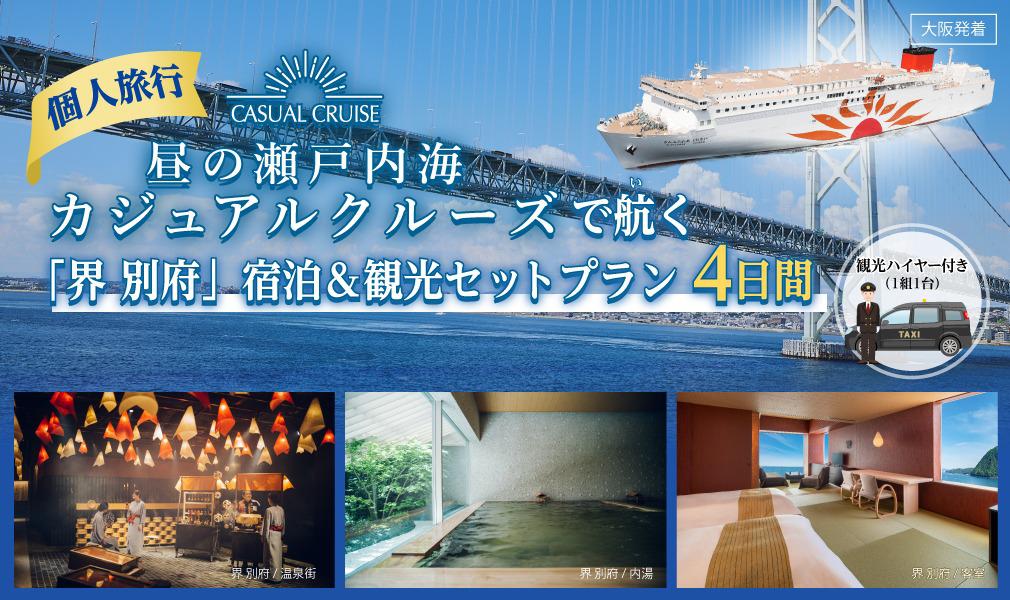 ※旅行代金には、往復フェリー運賃(往復同船室利用)、星野リゾート「界 別府」宿泊代(1泊2食付)、専用ハイヤー観光代、諸税が含まれます。