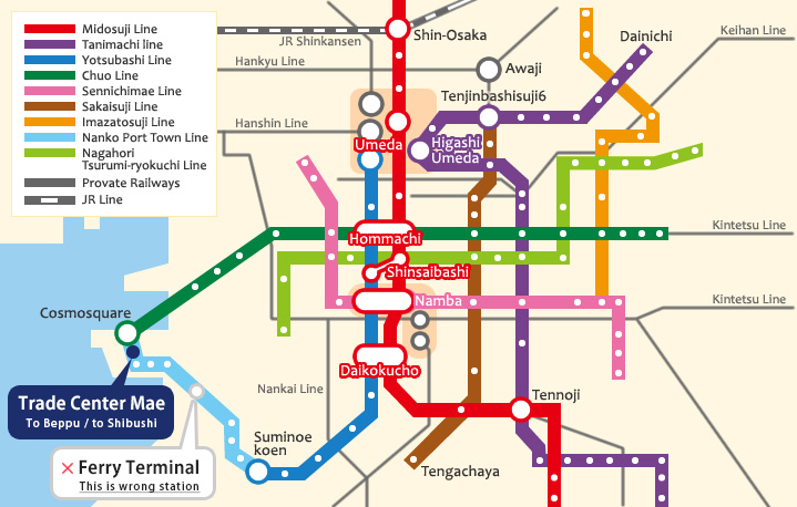 換乘地鐵御堂筋線,在「本町」站下車。從那裡換乘地鐵中央線並搭乘列車至「宇宙廣場」站。換乘Newtram線並搭乘newtram至「貿易中心」站。從那裡步行5分鐘,即可抵達第一總站。我們將以免費接駁車,從電梯大樓接送您前往第二總站。